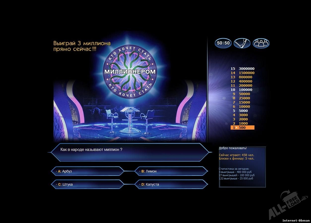 Как и в телеверсии, вам будут предложены 15 вопросов постепенно нарастающей сложности. Предлагаются четыре варианта ответов, из которых надо выбрать один верный. Стоит дать правильный ответ, как ваш игровой счет вырастет на соответствующую сумму: самый простой вопрос принесет 100 рублей, а самый сложный – миллион! Пусть в компьютерную игру можно играть бесплатно, и выигрыши ваши тоже останутся виртуальными, но удовольствия вы получите не меньше, положительные эмоции останутся с вами, а тренировка, которую вы устроите своему интеллекту, тоже пойдет на пользу.