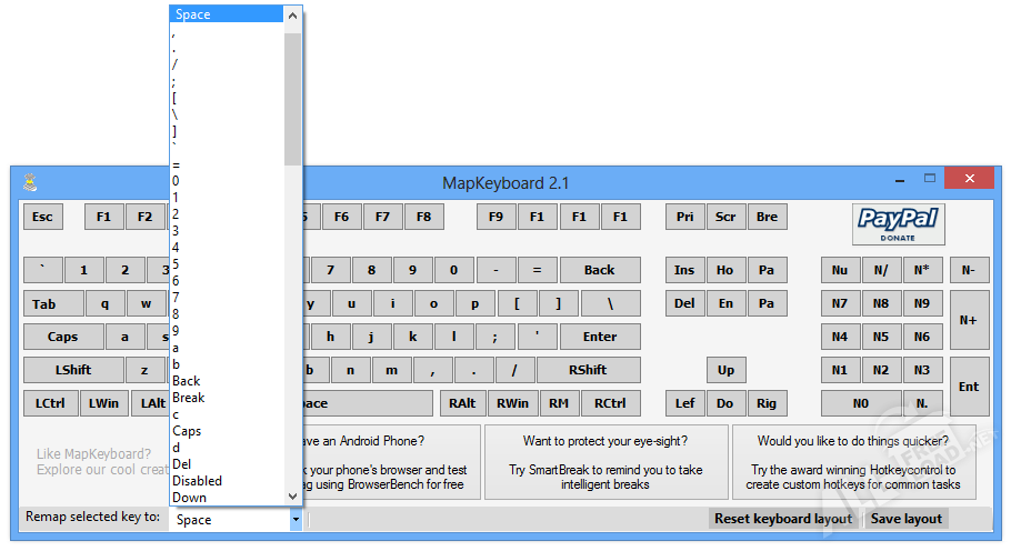 MapKeyboard – уникальная программа, предназначенная для замены стандартных назначений клавиш и отключения их при ненадобности. Пожалуй, каждый пользователь сталкивался с проблемами случайных нажатий на клавиатуре, но теперь это можно избежать. Все что потребуется,─ это скачать Mapkeyboard бесплатно на русском языке и установить. Небольшой пакет программы быстро перенесет все компоненты для работы на компьютер. При первом запуске будет высвечиваться текущая подключенная клавиатура со всеми ее клавишами. Стоит отметить, что такие системные кнопки как «Enter», «Esc», «Delete» и т.д. не могут быть переназначены. Они являются базовыми и отвечают за стандартные возможности устройства ввода.