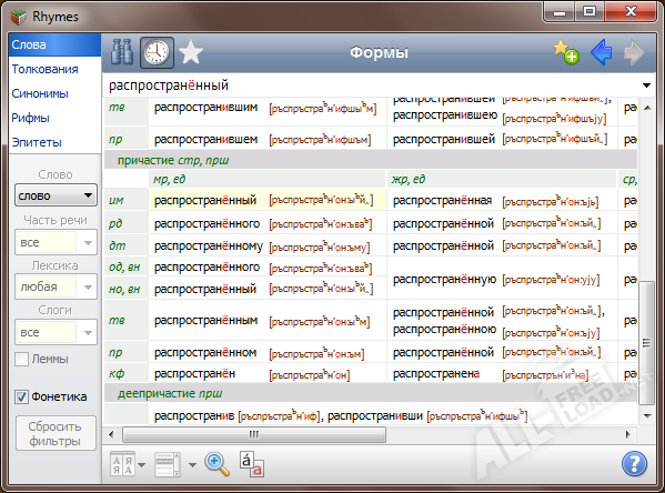 Вы наверняка согласитесь, что программа Rhymes, которая состоит из нескольких современных словарей и отличается большим количеством функций чрезвычайно удобна и полезна. Если ее еще нет на Вашем ПК, то обязательно уделите некоторое время на ее скачивание, Вы об этом никогда не пожалеете!