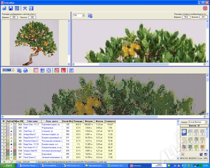 Программа EmbroBox предлагает пересмотреть схему – демонстрируется приблизительный вариант готовой вышивки и размер в сантиметрах. Дальше создается схема, на которой цвета обозначены специальными символами. Если для рисунка не нужен фон, он может быть прозрачным. Программа для вышивания генерируют схему в одном из вариантов отображения: с метками по центру, с сеткой или разноцветными ячейками. Схему можно масштабировать.