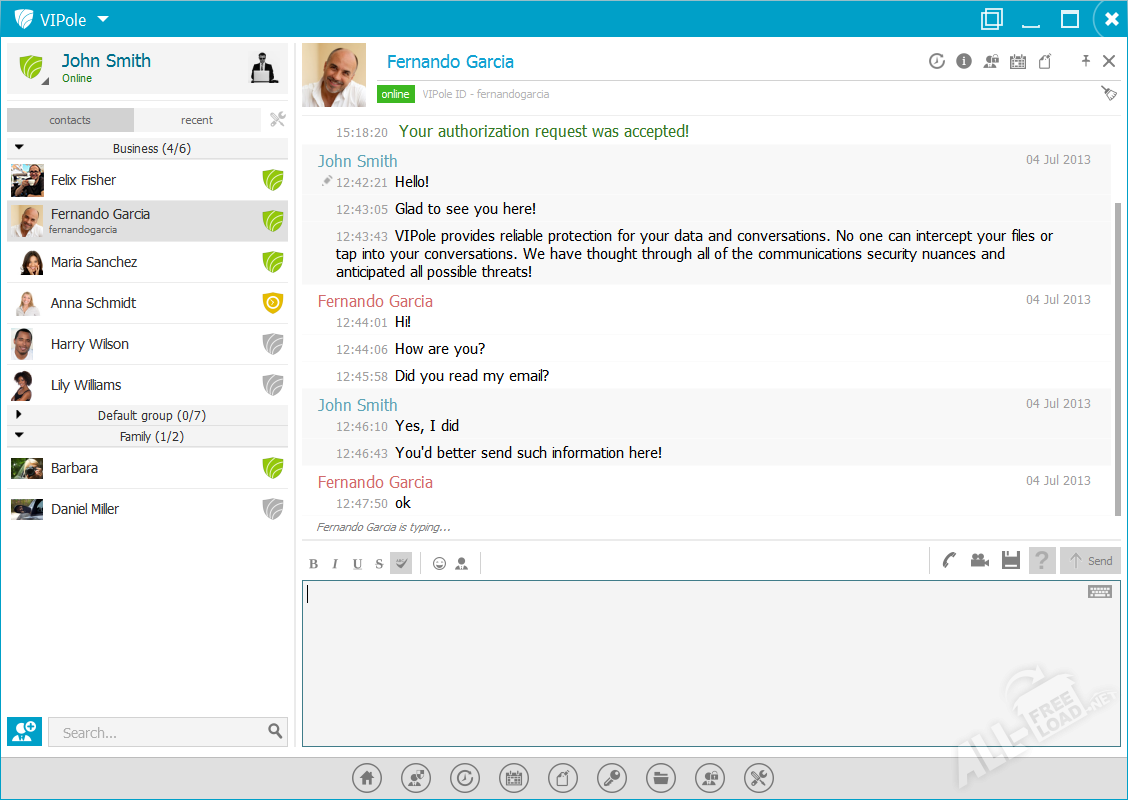 Vipole – простой в обращении мессенджер с более полным функционалом возможностей. Программа позволяет выполнять все привычные функции. Передавать файлы, добавлять контакты, делать заметки, создавать беседы, конференции и т. д. но при этом, имеет серьёзную защиту своих данных. Необходимо скачать Випол, создать учётную запись и начать пользоваться. Все данные помещаются на виртуальный диск в облаке, шифруется весь исходящий и входящий трафик, защита не уступает по надёжности банкам и крупным фирмам. Мессенджер подходит для регулярного использования, комической деятельности и совместных бесед. Доступна русская версия для Windows, что обеспечивает более быстрое ознакомление с рабочей средой.