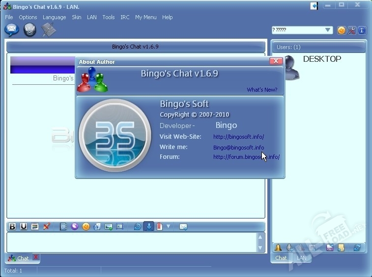 Bingo Chat – программа, которая создана и разработана для голосового и текстового локального сетевого общения. Распространяется по лицензии Freeware, и Bingo Chat скачать бесплатно на неограниченный срок использования может любой пользователь.