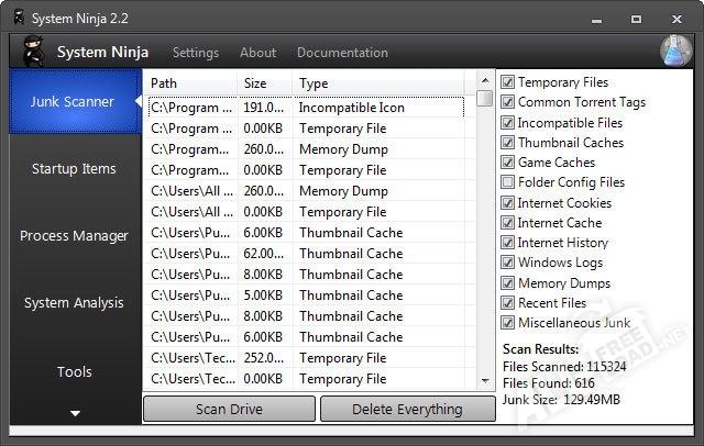 System Ninja — это достаточно небольшая программа, главным предназначением которой является качественная очистка персонального компьютера. На ПК часто скапливается различный нежелательный мусор и с помощью представленного программного обеспечения от него можно будет быстро избавиться. Операционная система Windows очень часто оставляет на жестком диске самые разные файлы и документы, от которых нет никакой пользы, они лишь загромождают память ПК и замедляют его работоспособность. Также мусором можно назвать накапливаемые документы и папки, в которых находятся дублирующие друг друга файлы. От всего перечисленного важно избавляться, чтобы компьютер оставался в надлежащем состоянии.