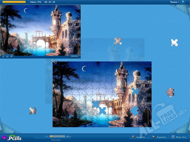 Всего в этой игре предусмотрено восемь групп с различными картинками, и тебе даётся возможность выбрать именно ту, которая наиболее подходит тебе по настроению. Кроме того, игра имеет три уровня сложности, которые различаются между собой по количеству имеющихся фрагментов. Е ты далеко не профессионал в этом деле, то рекомендуется начать с легкого уровня сложности, а уже затем, по мере накопления опыта, переходить к более сложному уровню. В игре предусмотрено множество различных функций, с помощью которых процесс собирания пазлов становится действительно приятным, и ничуть не утомляет. Поместить необходимый фрагмент в нужном месте можно, сделав всего лишь пару кликов мышью. Также имеются дополнительные экраны, которые способствуют удобному игровому процессу.