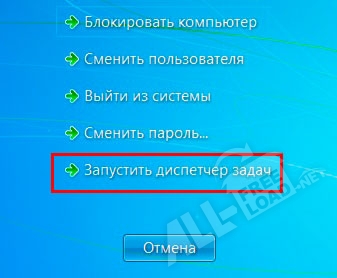Бывает, что это не помогает, программа долго отзывается или вообще не реагирует. В этом случае лучше вызвать специальное меню, в котором нужно выбрать диспетчера. Для этого необходимо воспользоваться сочетанием таких клавиш: ctrl+alt+del. На картинке ниже это видно.