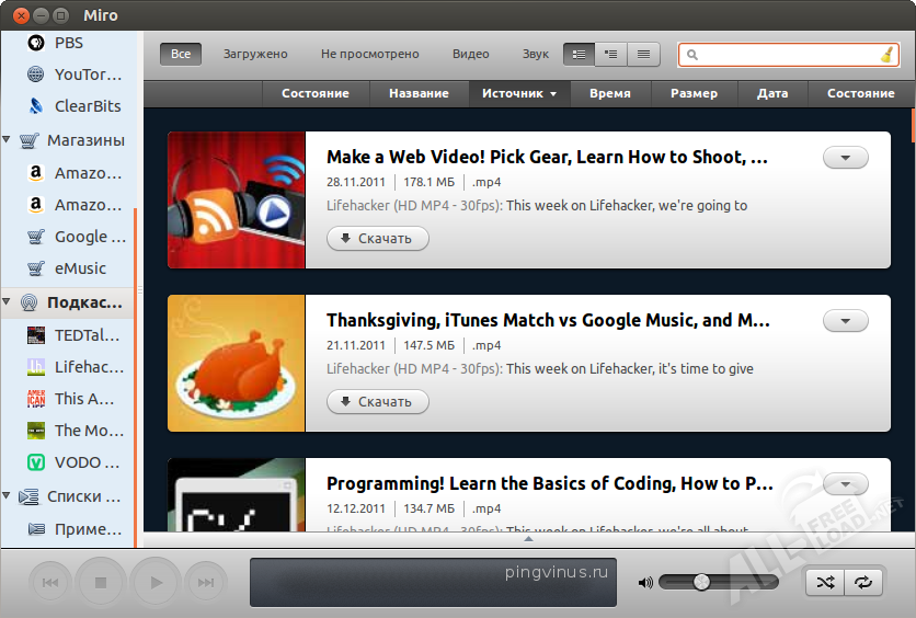 Достаточно компактный медиа-плеер Миро предназначен для воспроизведения HD видеороликов и обеспечивает полноэкранный просмотр без потери качества. Помимо этой функции, приложение позволяет использовать обширную базу данных для поиска нужной видеозаписи и загружать файлы на персональный компьютер. Встроенная библиотека телевизионных передач насчитывает порядка шести тысяч бесплатных каналов. Программа Miro поддерживает работу с множеством цифровых форматов, включая WMV, XviD, MPEG и другие. Загружать видеофайлы можно с таких популярных хостингов, как Revver, YouTube, BlogDigger и других аналогичных сервисов хранения мультимедийного контента.