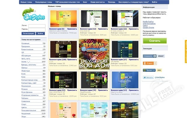 Компактное приложение Гет Стайлс устанавливается в список используемых расширений веб-браузера и дает возможность в любой момент поменять оригинальный вид страницы социальной сети Вконтакте на более красочное оформление. Встроенная библиотека программы содержит множество разнообразных тем, которые разбиты на соответствующие категории. Также при помощи стандартных инструментов Get Styles можно самостоятельно создавать варианты оформления страницы, исходя из личных предпочтений. Расширение оптимизировано под различные браузеры, среди которых Chrome, Firefox и другие.