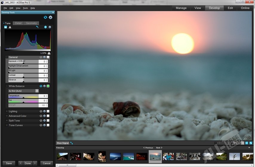 Арсенал инструментов редактора довольно обширный: наряду с традиционными для графических программ опциями по регуляции цветовых каналов, установке резкости и яркости изображения, ACDSee снабжен набором эффектов и фильтров, позволяющих радикально изменить изображения. Не менее широки и возможности систематизации файлов: в частности, встроенный анализатор редактора способен с высокой точностью находить дублированные файлов, что способствует экономии дискового пространства.