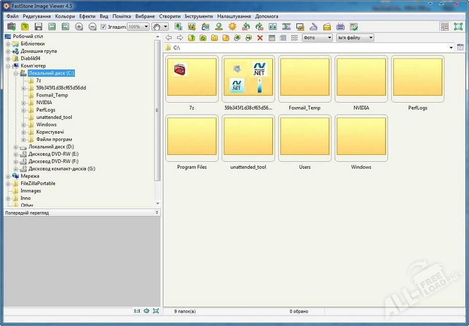 Интерфейс программы полностью на русском, поэтому понятен и прост в использовании. Полноэкранный вариант утилиты позволяет просматривать изображения в удобном режиме слайд-шоу, выбирая из 150 эффектов перехода. Слайд-шоу можно сопроводить и звуковым оформлением – имеется поддержка WMA, MP3, WAV форматов. В FastStone Image Viewer есть огромное количество разных инструментов, с помощью которых возможно удалить эффект так называемых красных глаз, изменять как угодно размер изображений или отправлять их по e-mail.