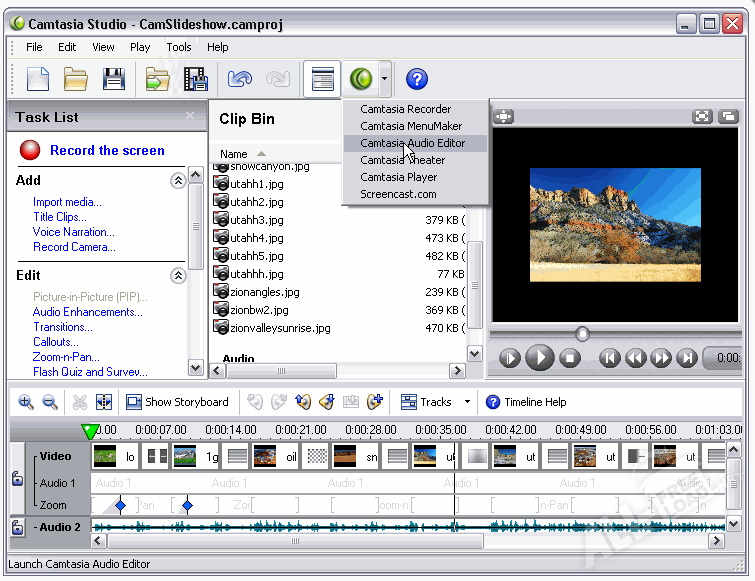 Утилита Camtasia Studio состоит из разнообразных инструментов, используемых для обработки и "шлифовки" объекта редактирования: подсветка курсора, опции графики и управления, встроенные видеокомментарии, переключение окон в мягком режиме, наложение текста поверх картинки, добавление опросных листов и прочие полезные возможности.