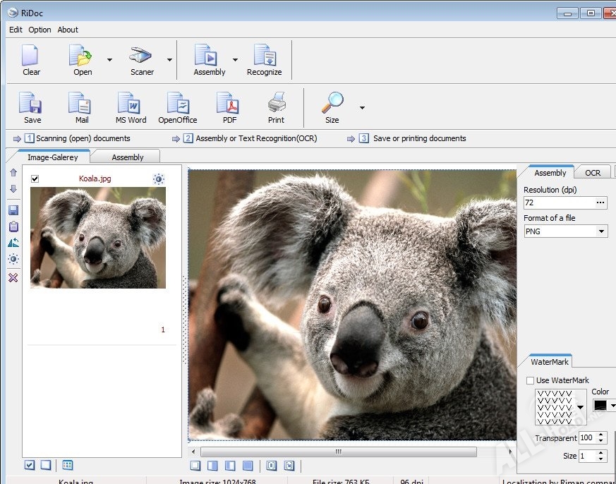 Интерфейс RiDoc простой и интуитивно понятный, работать с утилитой несложно. Утилита приспособлена для работы со сканерами, обладающими функцией автоматической подачи листов. Отсканированные изображения сохраняются в нескольких популярных форматах. Программа позволяет менять разрешение файла, а также производить другие настройки. Кроме этого, есть возможность сохранения изображений в виде файла PDF и в файл Word. При необходимости на изображение накладываются водяные знаки. Полученные в результате сканирования файлы можно сохранить при помощи «Быстрых папок». Программа позволяет отправить полученную электронную версию документа по электронной почте, а также сохранить все варианты документов в один общий файл.