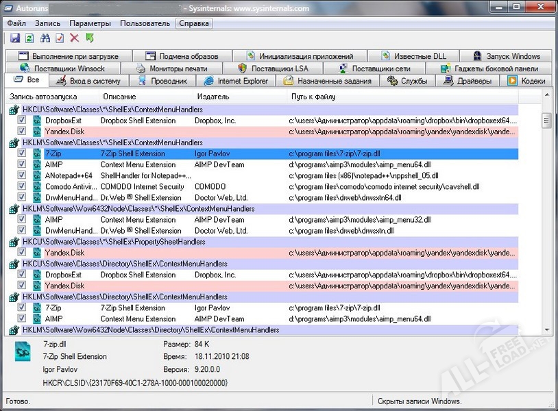Программа Autoruns, созданная специально для Windows, позволяет работать отдельно с каждым из этапов автозагрузки, копируя, удаляя, а также просматривая свойства элемент. Чтобы просто отменить автоматический запуск программы, достаточно будет снять галочку с нужного пункта. Есть возможность подробнее узнать об элементе при помощи поиска Google, который выдаст результат, где будет дана о нём исчерпывающая информация. Autoruns позволяет просмотреть список DLL-библиотек, системных служб, системных расширениях и точно так же получить по каждому из них информацию. Есть возможность управления и редактирования этого списка.