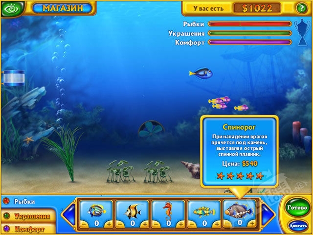 Золотые плитки, которые вы собираете в процессе игры, если полную версию бесплатно скачать, созданы не просто так, а чтобы создать красивый аквариум, где у вас будут обитать красочные представители морского мира. Каждому уровню соответствует определенная сумма, которая поможет вам приобрести именно то, что вы хотите. «Клоун Кларк» или «Рыба-бабочка» - всё в ваших руках, если у вас есть золотые плитки, больше животных вы увидите, если играть в Фишдом 3. А чтобы рыбки прожили у вас как можно дольше, вы можете поставить в аквариум различное специальное оборудование, к примеру – терморегулятор, фильтр и другие. Декоративные компоненты создадут уникальную эстетическую оболочку в аквариуме.