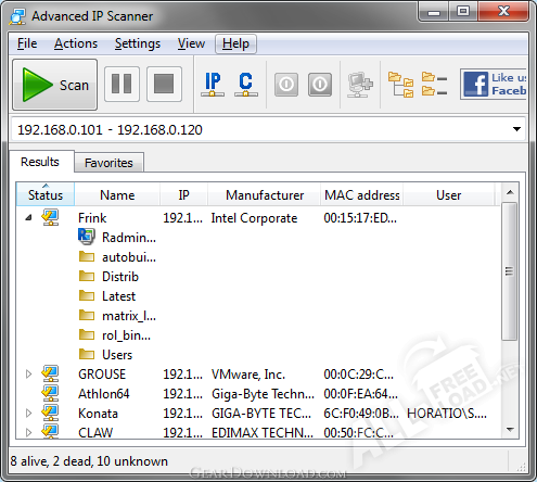 Advanced IP Scanner — приложение, сканирующее сетевые IP для Windows. Программа ищет устройства в сети, соединяющей компьютеры, и проверяет их порты. Утилита дает возможность осуществить доступ к разным документам машин, которые находятся в сети. Это могут быть общие файлы, HTTP и FTP. Программа Advanced IP Scanner обеспечивает пользователя информацией о всех устройствах, входящих в локальную сеть: именами компьютеров, компаний-изготовителей карт для сети, IP адресами.