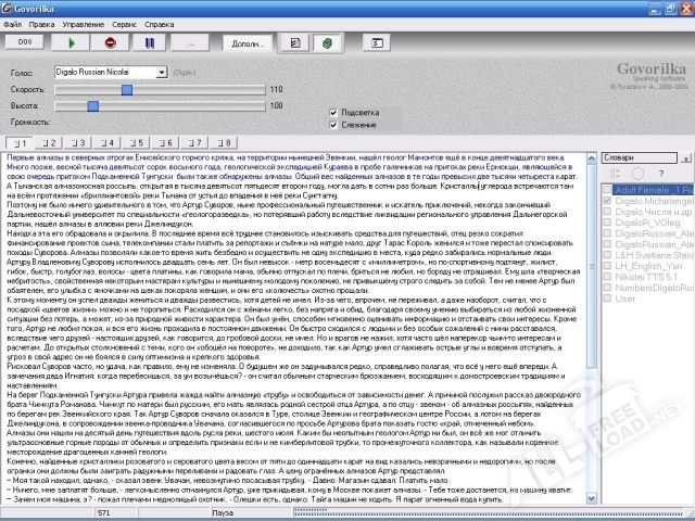 Govorilka – приложение для воспроизведения текстов на любом языке. Программа способна воспроизвести любой текст как мужским, так и женским голосом. Говорилка будет полезна пользователям, предпочитающим прослушивание текстов их чтению, людям со слабым зрением, а также людям, изучающим иностранные языки. Скачать Govorilka вы можете на данном сайте.