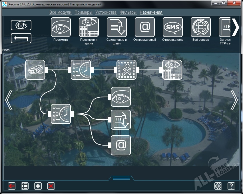 С помощью программного продукта Ксеома возможно организовать профессиональное видеонаблюдение, используя подключенную к персональному компьютеру веб-камеру. Отличительной особенностью программы является поддержка абсолютно любых разновидностей видеокамер, включая USB-устройства, аналоговые веб-камеры и IP-видеокамеры. В случае обнаружения каких-либо действий в помещении (для этого используется встроенный датчик движения) программа Xeoma может оповестить об этом любым из доступных способов: звуковым сигналом или сообщением на электронную почту. Также возможна отправка фотографии непосредственно на удаленный сервер по FTP-протоколу передачи данных. Полная версия приложения включает в себя полный набор встроенных инструментов, которые предоставляют расширенные возможности для видеонаблюдения.