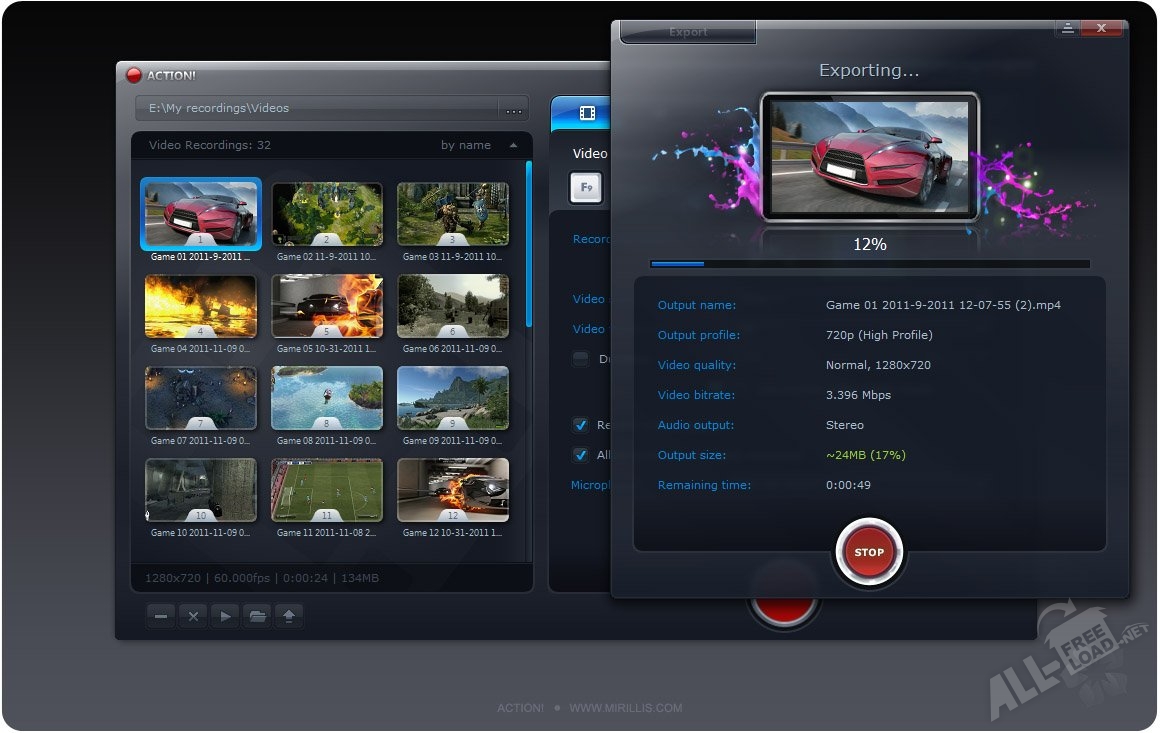 При записи видео с экрана ПК есть возможность выбирать расширение, формат и частоту кадра будущего видеофайла. Кроме того утилита имеет специальный режим для записи с веб плееров. Если пользователь хочет скачать программу Mirillis Action для live-трансляции, то ему также будет доступен контроль FPS, количества данных в единицу времени и выбор сервиса, на котором будет проходить вещание (YouTube, Livestream и т. д.). Запись аудио может быть сохранена в форматах MP4, WAV, а скриншот в JPEG, BMP и PNG.
