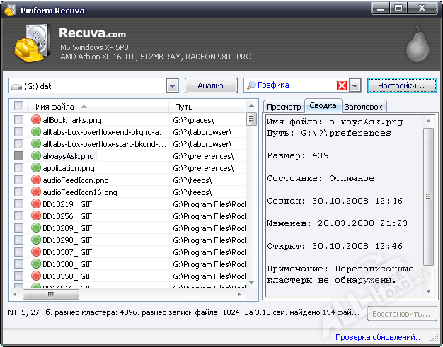 Отсутствует система фильтрации, но имя файла или его расширение указывается в активном поле «Find». Recuva отображает удаленные системные файлы, скрытые документы, а также те, у которых нулевой размер. Преимуществом является наличие версии на русском языке.
